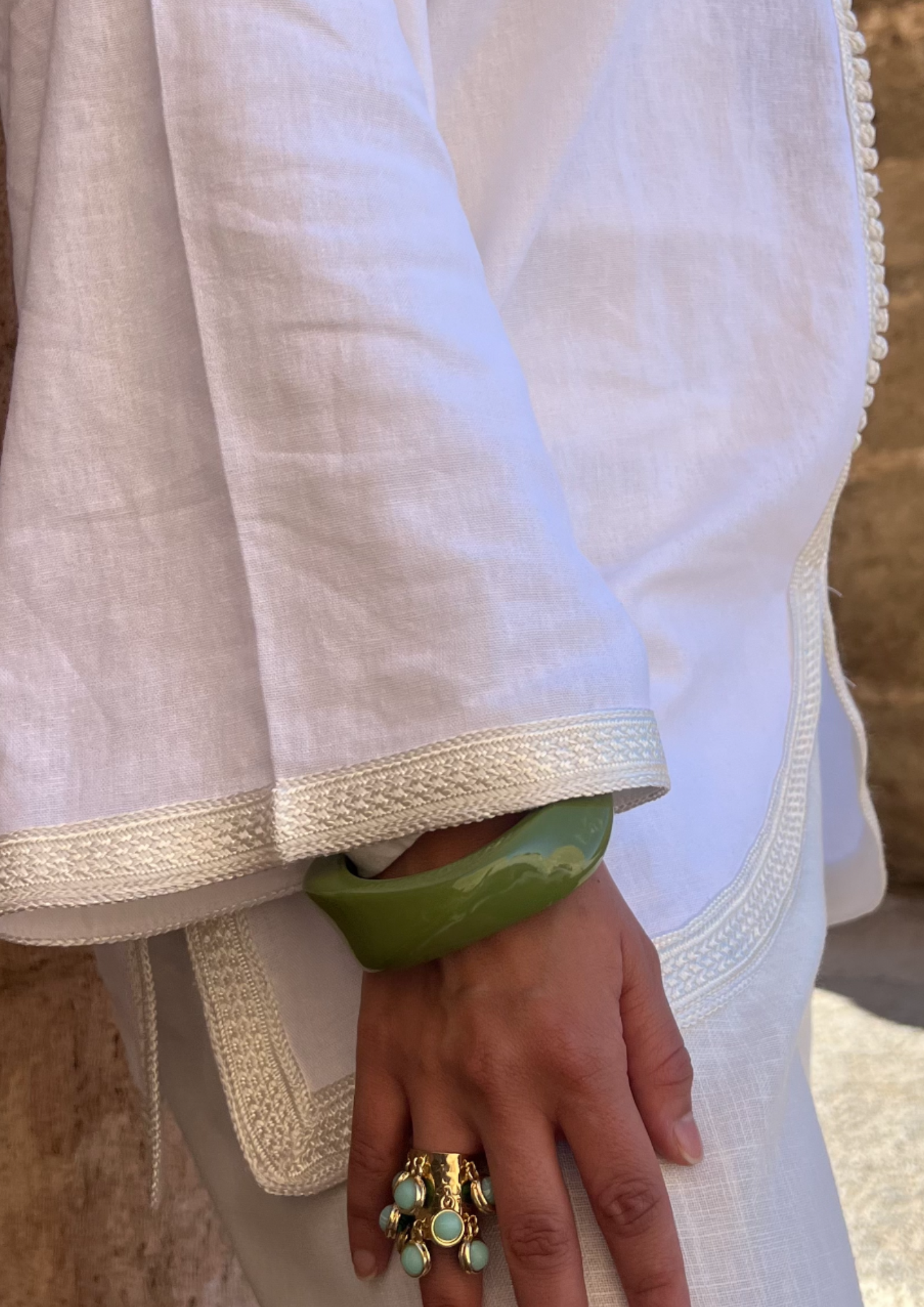 Ensemble marocain imaginé et créé par mes soins, alliant tradition et modernité. Confectionné dans un tissu type lin, il offre une coupe fluide et élégante. Le pantalon et de la même couleur que la sfifa ( blanc écrue ) Taille unique, la tunique est ajustable à la taille ou aux hanches selon l’envie, pour s’adapter à toutes les silhouettes avec confort et style
