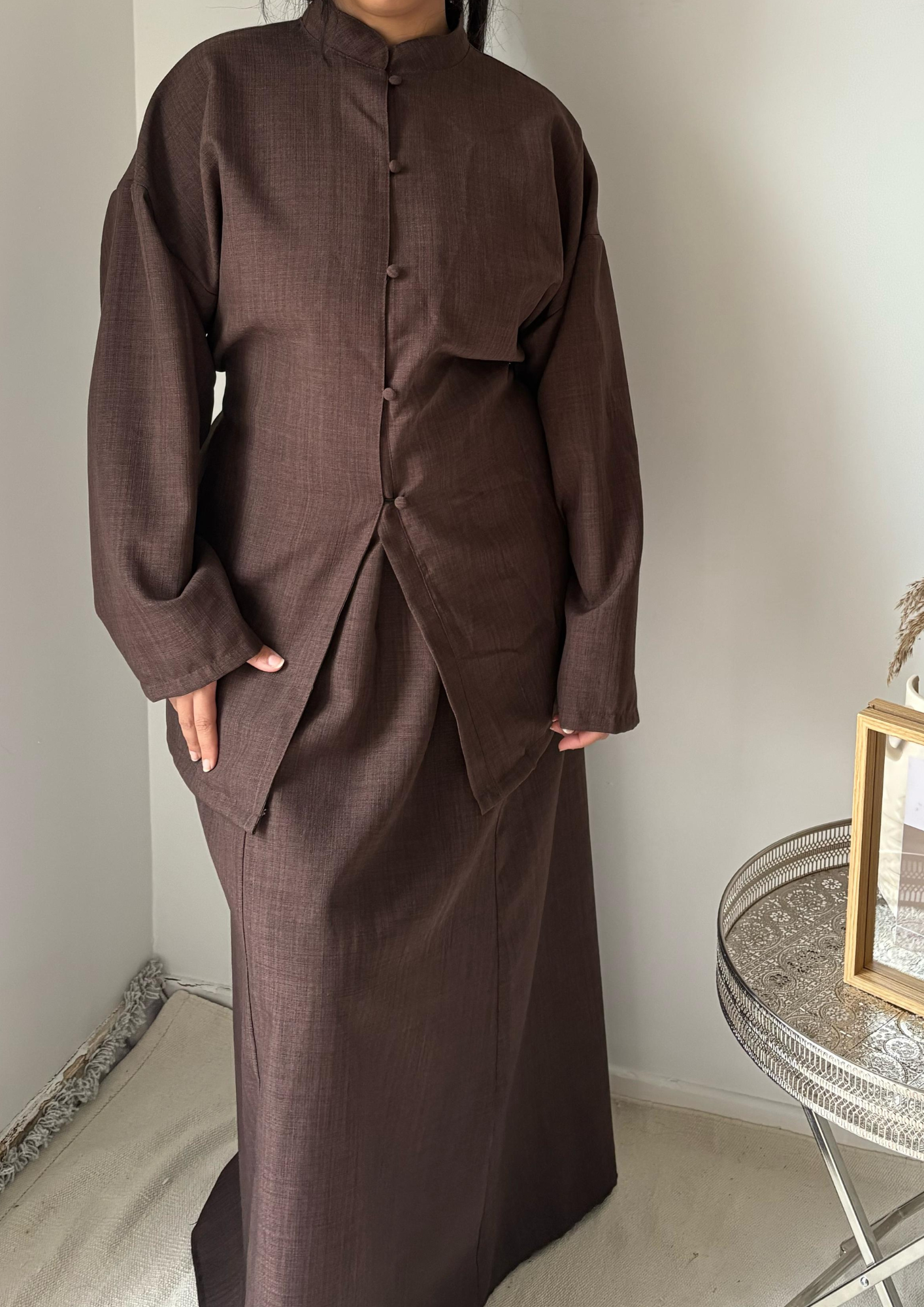 Découvrez notre ensemble en type lin ,composé d'une tunique et d'une jupe longue. La tunique possède une ceinture à attacher à l’arrière pour une silhouette cintrée.